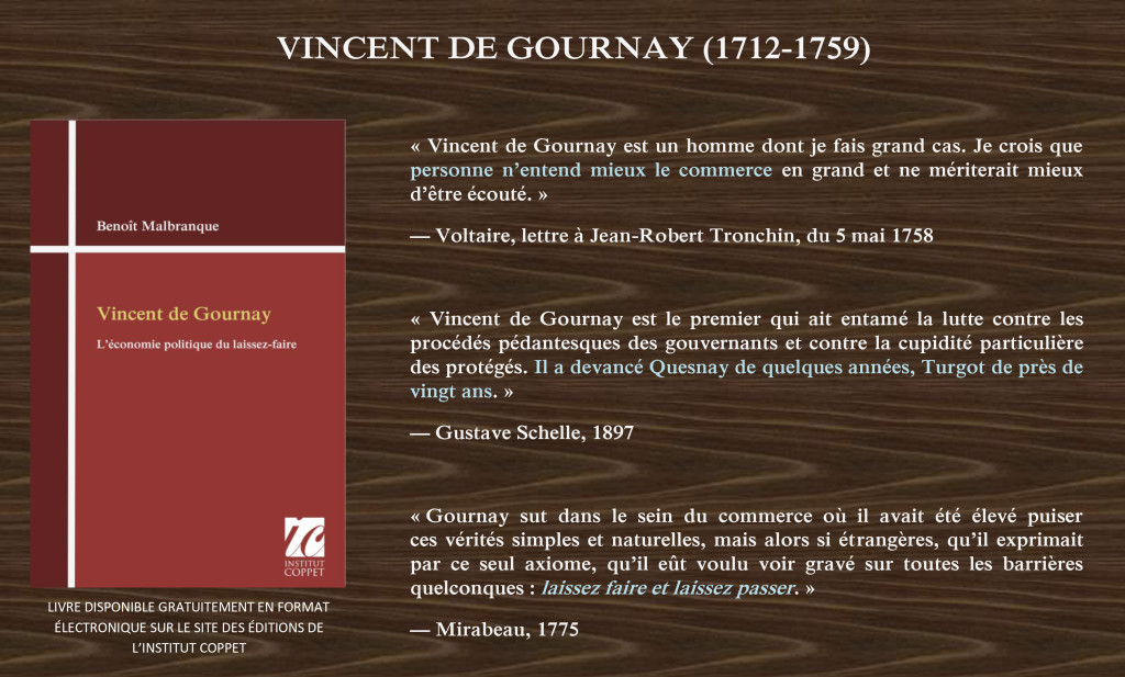 Vincent de Gournay (1712-1759), initiateur oublié du libéralisme économique en France, a fait l’objet d’un livre par Benoît Malbranque, qui paraît aujourd’hui aux éditions de l’Institut Coppet. Ce livre, qui s’appuie sur les manuscrits de Gournay découverts en 1976, est à retrouver en format papier et gratuitement dans 5 formats électroniques (epub, mobi, html, pdf et doc) à l’adresse suivante : //editions.institutcoppet.org/produit/benoit-malbranque-vincent-de-gournay-leconomie-politique-du-laissez-faire/