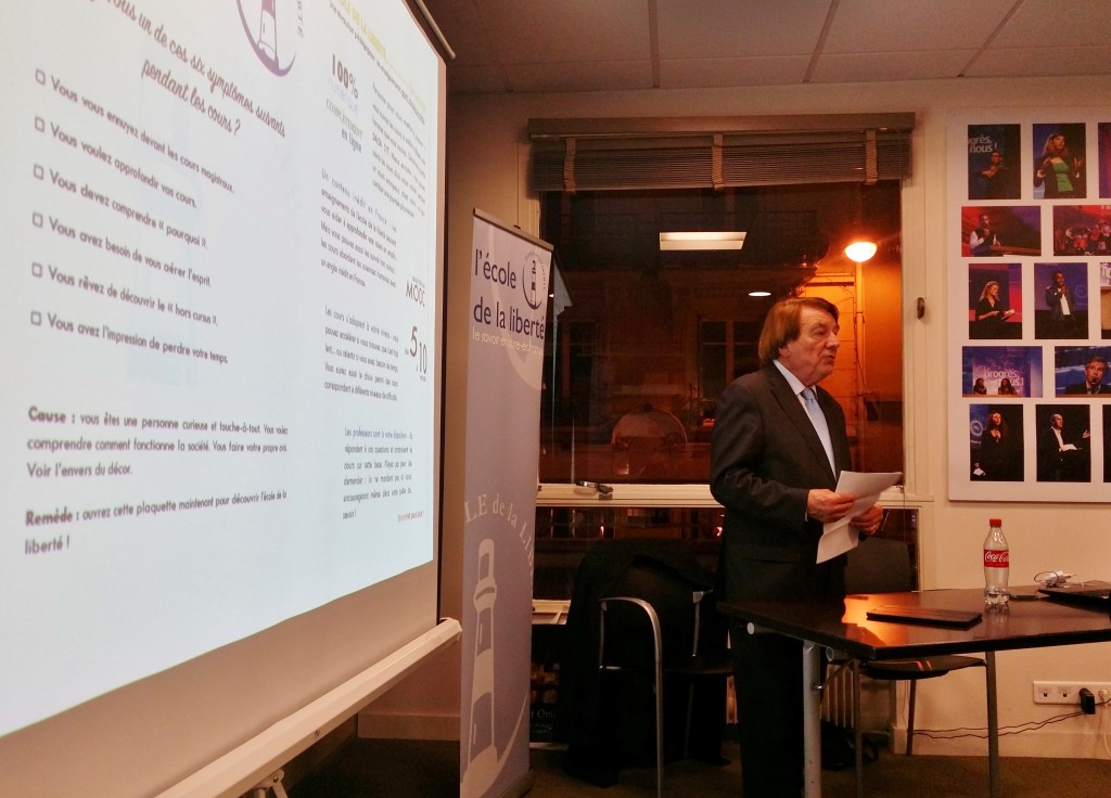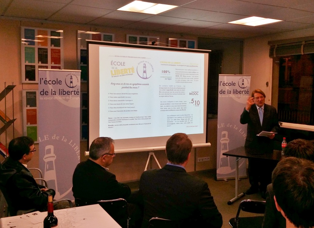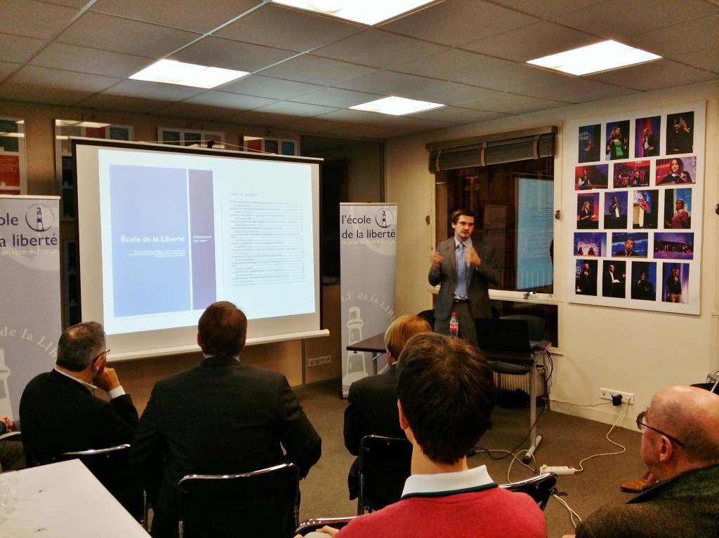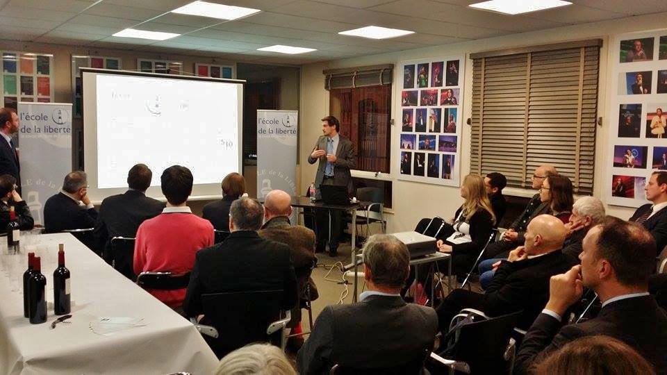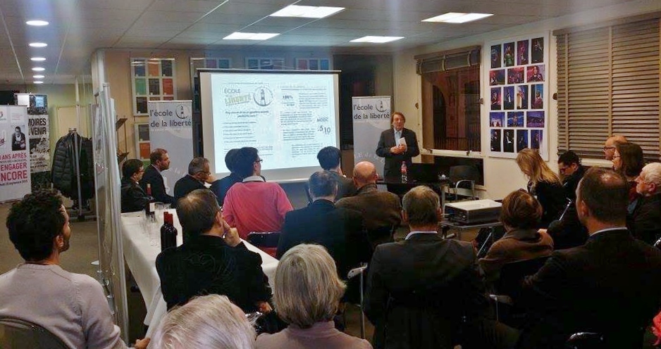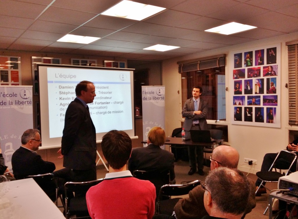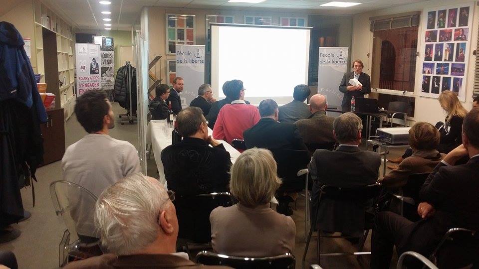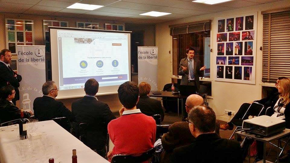 logo ELLe vendredi 4 décembre, avait lieu à Paris, dans les locaux de la Fondapol, le cocktail de lancement de l’école de la liberté. Une trentaine de participants, amis, donateurs, professeurs et soutiens divers, étaient présents avec toute l’équipe de bénévoles qui travaille sur le projet. Après une présentation-bilan de l’action menée et des perspectives pour 2016 (voir slides ci-dessous), une série d’échanges spontanés a permis de répondre aux nombreuses questions. Puis le professeur Pascal Salin, président du comité scientifique, a donné une petite causerie d’une vingtaine de minutes sur les enjeux de la formation intellectuelle et de la diffusion des idées de liberté (voir photos tout en bas). La soirée s’est terminée avec un buffet-dînatoire amical.