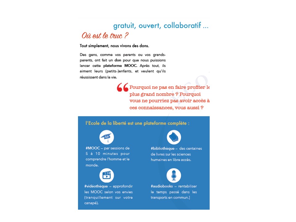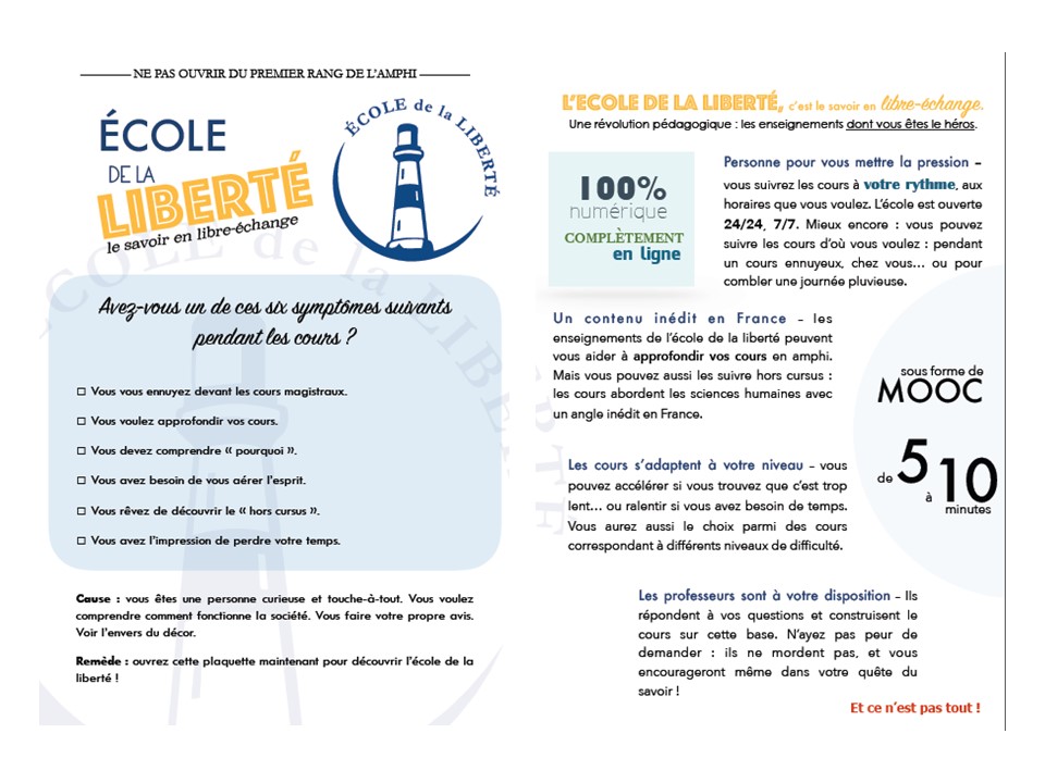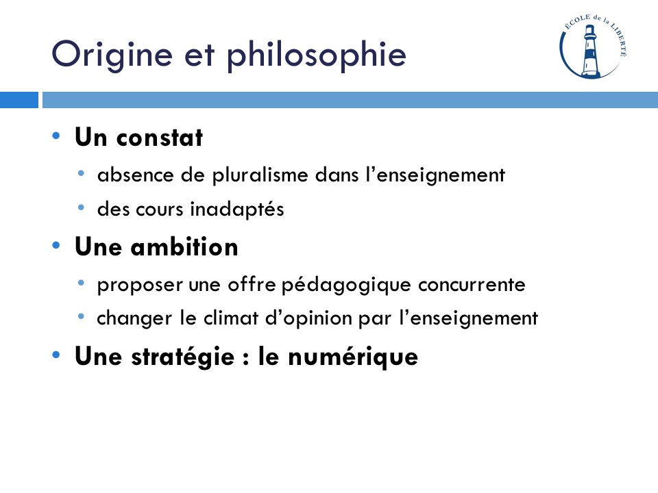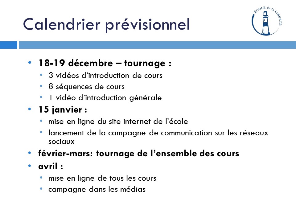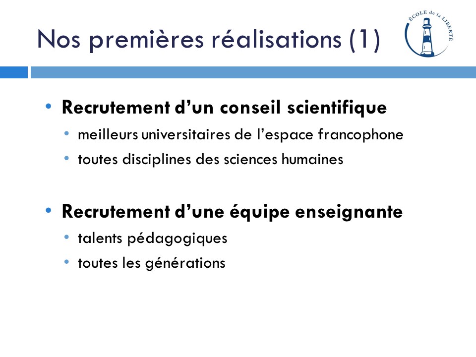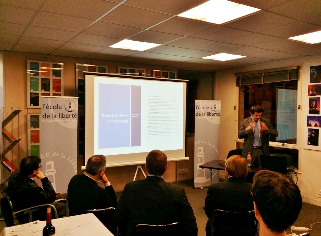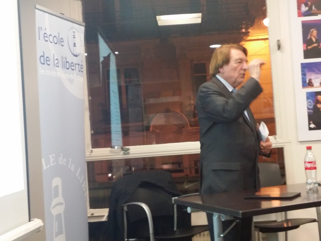 logo ELLe vendredi 4 décembre, avait lieu à Paris, dans les locaux de la Fondapol, le cocktail de lancement de l’école de la liberté. Une trentaine de participants, amis, donateurs, professeurs et soutiens divers, étaient présents avec toute l’équipe de bénévoles qui travaille sur le projet. Après une présentation-bilan de l’action menée et des perspectives pour 2016 (voir slides ci-dessous), une série d’échanges spontanés a permis de répondre aux nombreuses questions. Puis le professeur Pascal Salin, président du comité scientifique, a donné une petite causerie d’une vingtaine de minutes sur les enjeux de la formation intellectuelle et de la diffusion des idées de liberté (voir photos tout en bas). La soirée s’est terminée avec un buffet-dînatoire amical.