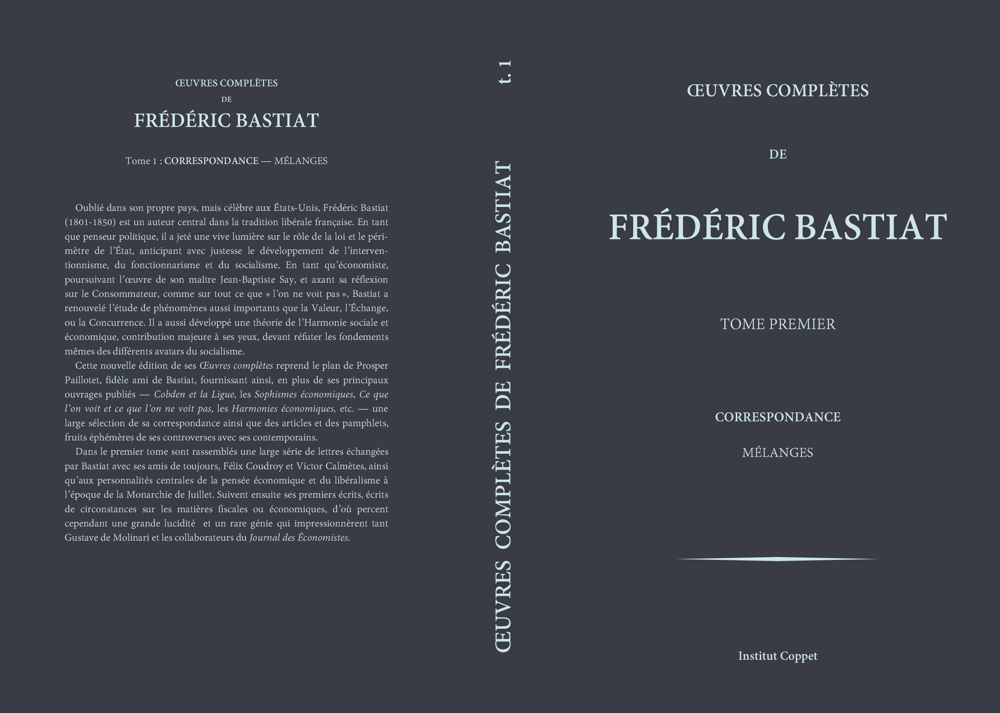 Dans le premier tome sont rassemblés une large série de lettres échangées par Bastiat avec ses amis de toujours, Félix Coudroy et Victor Calmètes, ainsi qu’aux personnalités centrales de la pensée économique et du libéralisme à l’époque de la Monarchie de Juillet. Suivent ensuite ses premiers écrits, écrits de circonstances sur les matières fiscales ou économiques, d’où percent cependant une grande lucidité et un rare génie qui impressionnèrent tant Gustave de Molinari et les collaborateurs du Journal des Économistes.