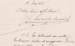 Deux lettres additionnelles : 14 janvier 1884 (1 page). J.-G. Courcelle-Seneuil transmet une note lue à l’Académie quelques jours auparavant. — Sans date (1 page). J.-G. Courcelle-Seneuil envoie des épreuves qu’il prie Arthur Mangin de lire au plus tôt.