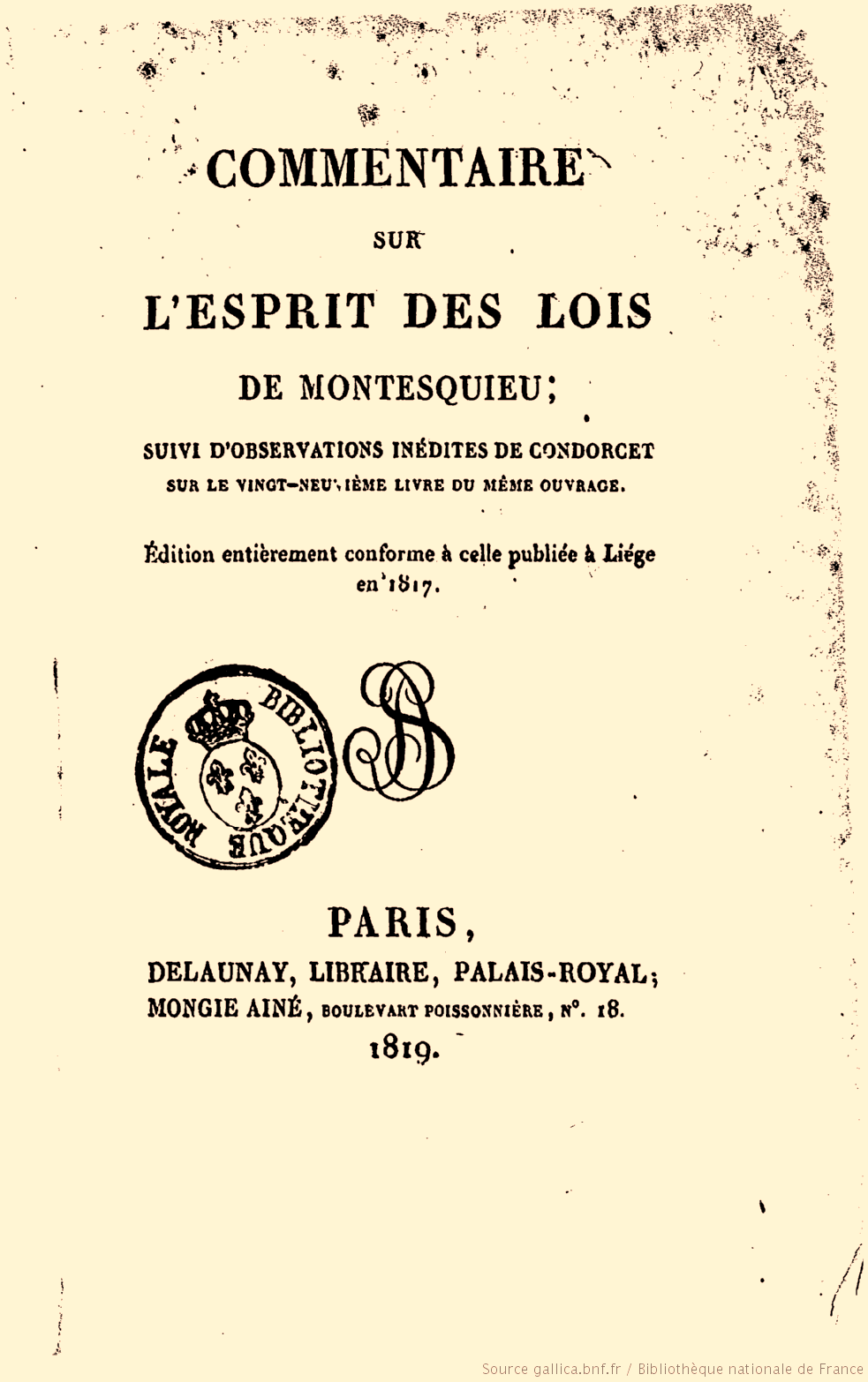 Interdit en France, ce Commentaire sur L’Esprit des Lois, fut d’abord traduit en anglais et publié à Philadelphie par Jefferson en 1811. La première publication en français date de 1817, à Liège et la seconde de 1819 à Paris.