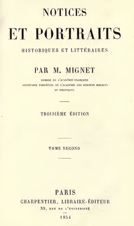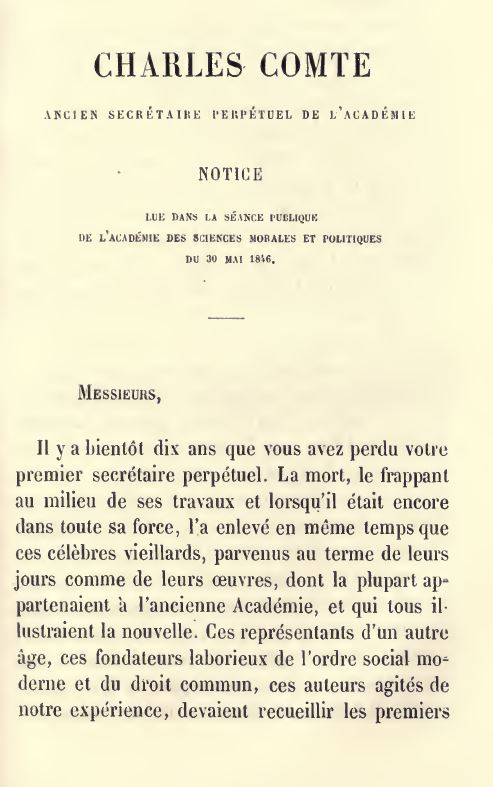 J’aurais même incliné, je ne le cacherai pas, à vous entretenir de tous ceux de nos confrères auxquels se rattache le souvenir des grands événements de notre récente histoire, avant de retracer la vie des hommes plus jeunes qui leur ont succédé dans la carrière de la science ou de la politique ; mais il m’a paru qu’il convenait de ne pas différer davantage l’éloge de celui d’entre eux que, par un libre choix, vous aviez appelé aux fonctions de secrétaire perpétuel, et que j’ai eu pour prédécesseur dans votre confiance. D’ailleurs, M. Charles Comte, que la générosité de ses doctrines et l’énergie de sa conduite rapprochent des penseurs du dernier siècle et des acteurs de la Révolution, a naturellement sa place dans leur compagnie, qu’il ne dépare pas par ses talents, et qu’il honore par son caractère.