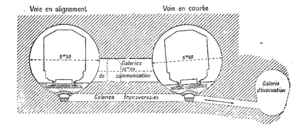 Après de patientes études, sous la direction de notre dévoué collègue Sartiaux, ingénieur en chef du Nord, il a été décidé qu’au lieu d’une grande voûte, comme celle du Métropolitain, seraient creusés deux tunnels cylindriques distants de 15 mètres et reliés par des rameaux transversaux.