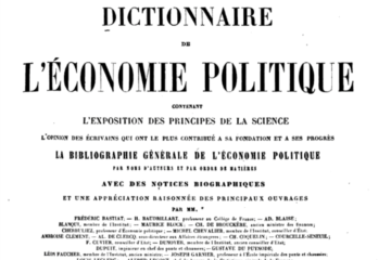 Le couronnement du mouvement de l’économie politique française de la moitié du XIXe siècle a été la publication par l’entreprise Guillaumin des deux volumes du Dictionnaire d’économie politique édité par Charles Coquelin (1802-1852) et Gilbert Guillaumin (1801-1864) en 1852-53, qui étaient tous deux des contemporains proches de Bastiat. Guillaumin était l’organisateur du projet et Coquelin était le rédacteur en chef brillant qui avait une mémoire photographique et une vision radicale de ce que pouvait réaliser l’économie politique. Les 2 volumes comprenaient plus de 1800 pages de deux colonnes de texte imprimé, où écrivaient des dizaines de contributeurs en étroite collaboration. Comme Clément le mentionnait dans l’introduction, ce fut l’occasion pour l’économie politique de se définir comme membre à part entière des sciences sociales, sur un pied d’égalité avec les sciences de philosophie morale politique, plus anciennes et mieux établies. Le dictionnaire contenait des articles approfondis sur des sujets théoriques tels que l’échange, le prix, le loyer et la valeur ; des articles biographiques sur les figures majeures comme mineures de l’économie politique comme Smith, Say, Malthus et Ricardo ; et des dizaines de courts articles sur les principales revues, magazines, mouvements et organisations. Ainsi que d’importantes bibliographies et des résumés des travaux théoriques clés. Il convient de garder à l’esprit que le Dictionnaire a été préparé et est apparu pendant une période de turbulences extrêmes en France, qui comprenait la Révolution de février, la montée du socialisme, la création de la Deuxième République, et l’arrivée au pouvoir de Louis-Napoléon. La publication a également coïncidé avec la mort prématurée de plusieurs personnages clés du mouvement de l’économie politique, comme Bastiat et Coquelin, qui sont morts de maladies longues, et d’autres qui sont morts de l’épidémie de choléra de 1849, ce qui a fortement réduit le nombre des économistes politiques de la génération montante.