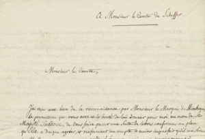 Je vous prie donc, Monsieur le comte, de me pardonner l’intervalle qui s’est écoulé entre ma dernière lettre et celle-ci, et d’en solliciter le pardon auprès du Roi. Il me sera à jamais impossible d’avoir avec ce prince ou avec vous des torts qui ne soient pas forcés et involontaires.