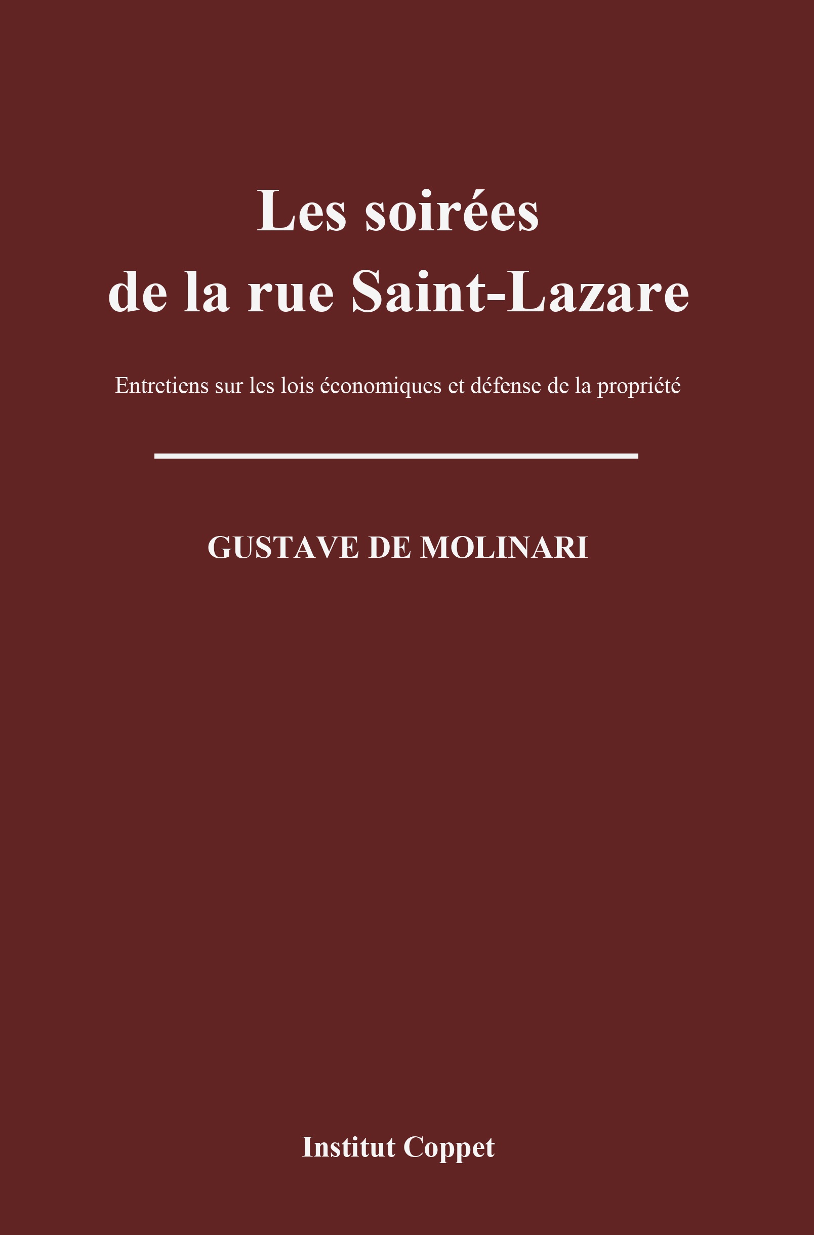Les Soirées de la Rue Saint-Lazare sont un dialogue mêlant un économiste, un socialiste et un conservateur. C’est un texte de jeunesse de Molinari, publié en 1849 dans le contexte de la Révolution de 1848. Molinari est l’exact contemporain de Marx — ils naissent tous deux à un an d’intervalle — et ce texte est publié un an après le Manifeste du Parti communiste. On peut d’ailleurs considérer les Soirées comme la réponse libérale au socialisme qui se développait à l’époque.