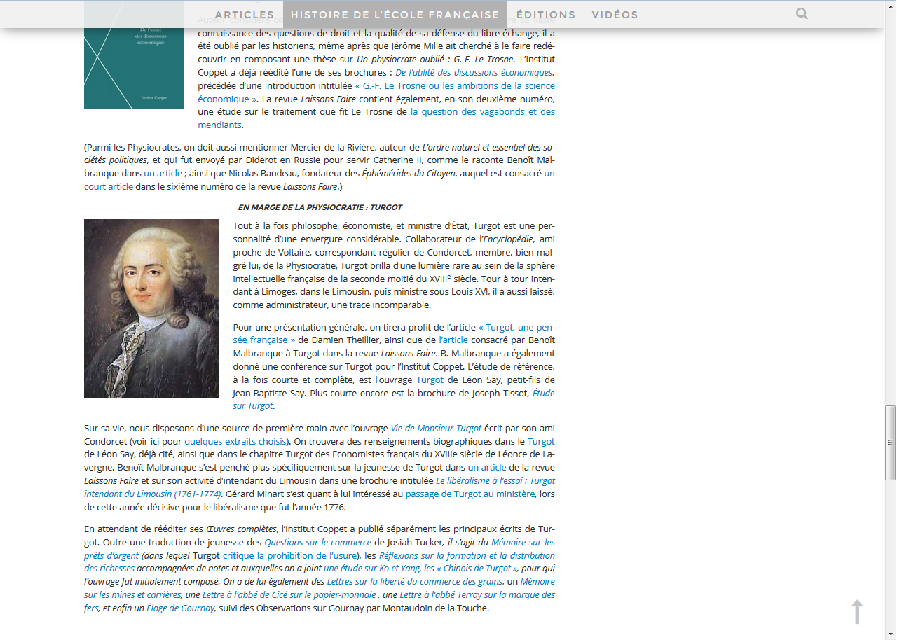 Pour l’Institut Coppet, Benoît Malbranque a bien voulu établir cette page. Il s’est agi, tout d’abord, d’offrir une présentation générale de l’école française, avec pour chaque auteur, dans la mesure du possible, une sélection d’articles synthétiques qui permettent de découvrir l’auteur en question et sa pensée. La page a ensuite était complétée par l’agglomération la plus exhaustive possible des articles, ouvrages ou vidéos que nous avions à proposer pour chaque auteur.